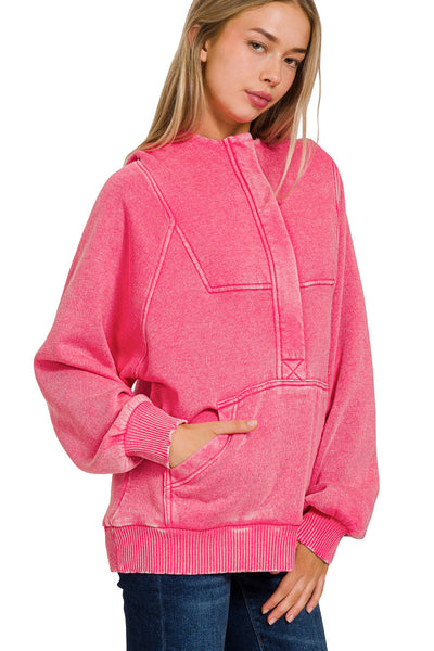 Stay warm, cozy, and effortlessly cute in our Frosted Ridge Hoodie. This oversized fleece pullover features a soft vintage acid-washed finish, giving each hoodie its own unique character and lived-in charm. With its quarter-zip neckline, relaxed silhouette, and spacious kangaroo pocket, it blends comfort and practicality for everyday winter wear. Perfect for chilly mornings, cozy cabin days, and everything in between.