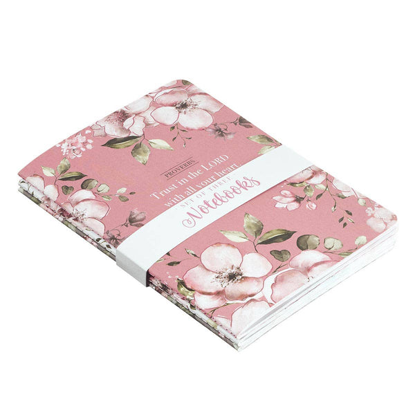 Pink blossom theme, Pink foil accents, Trust in the Lord with all your heart and do not lean on your own understanding., Proverbs 3:5, Trust in the Lord with All Your Heart Collection, 3-piece notebook set, Medium notebook set, Heavy-duty cardstock covers, 64 lined pages each, Wrapped in o-wrap, Set size: 7.5" x 5.3" x 0.6" (191 x 133 x 15mm), Individual notebook size: 7.5 x 5.3" x 0.15" (216 x 155 x 5mm)
